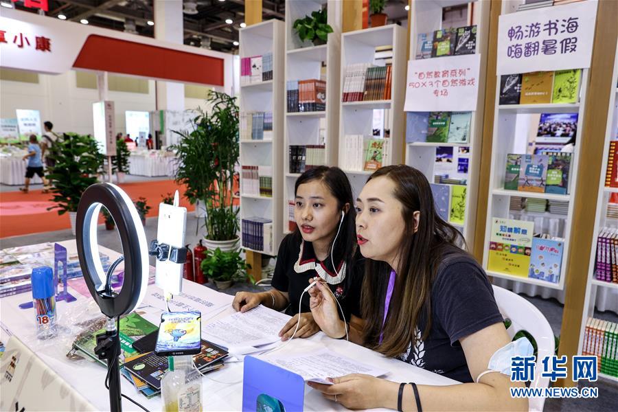 7月23日,两位参展工作人员在网上直播介绍图书。当日,第十届江苏书展在江苏苏州开幕,400多家出版发行单位参展,吸引众多读者选购图书。新华社记者杨磊摄