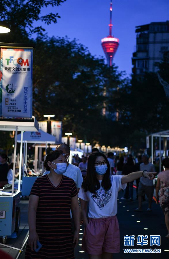 7月23日晚,市民在成都市成华区望平街滨河路的天府文创大集市上游玩。新华社记者 王曦 摄