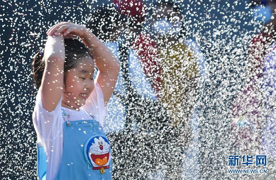 7月24日,一名小女孩在北京华熙LIVE·五棵松商业街区的一处喷泉戏水。北京市气象局7月24日傍晚发布称,24日截至16时30分,平原大部分地区出现37℃以上高温天气,局地气温超过40℃。北京市已于23日发布高温蓝色预警,预计25日全市大部分地区日最高气温仍将达35℃以上。新华社记者陈晔华摄