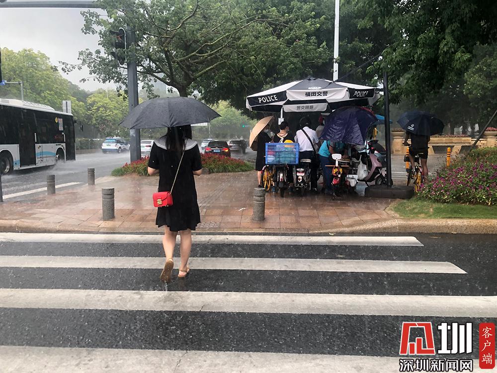 雨势较大,市民纷纷躲在交警执勤使用的雨伞下避雨。