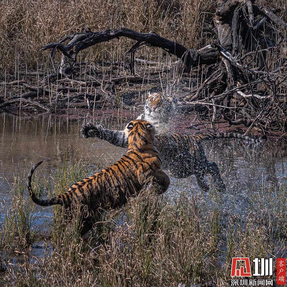 2020年7月27日,猛虎斗有多壮观?来自印度德里的41岁职业业摄影师Nitish Madan,在在印度北部伦滕波尔国家公园游览时,见证了两只老虎幼崽激烈的水上争夺战。从画面中可以看到,两只足足有200磅重的孟加拉虎,面对面互相咆哮,伸出虎爪凶猛至极,才15个月大就已经有了王者风范。