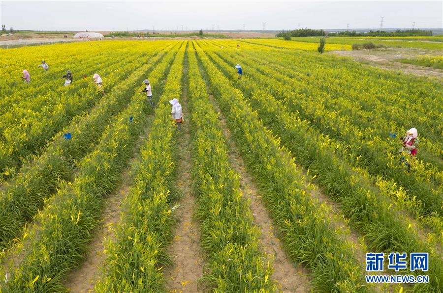 村民在宁夏红寺堡区柳泉乡柳泉村采摘黄花菜(7月11日摄,无人机照片)。新华社记者 杨植森 摄