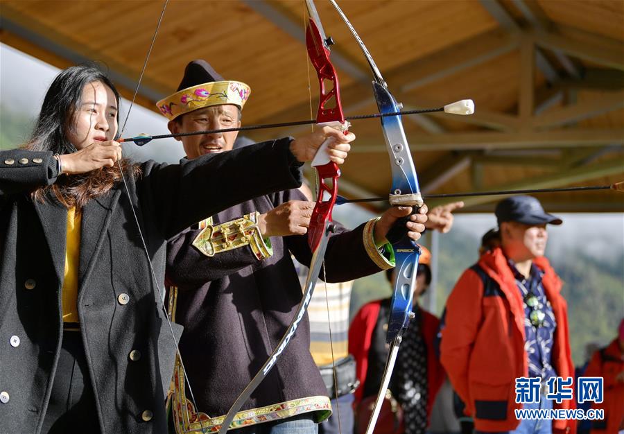 一名游客在当地农牧民的指导下射击响箭(7月26日摄)。新华社记者 张汝锋 摄