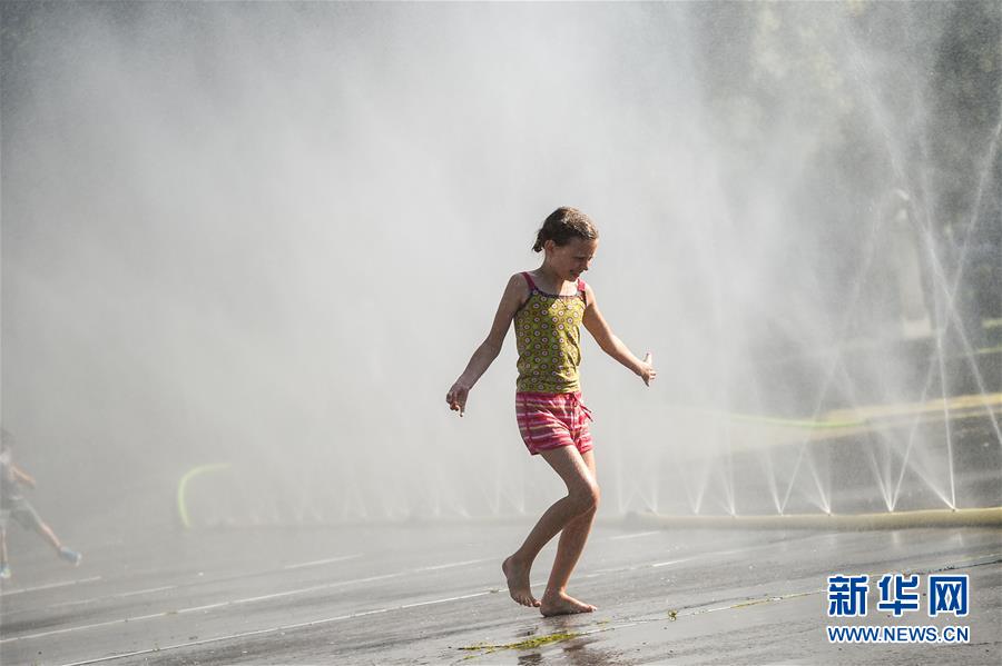 7月28日,在奥地利维也纳,一名女孩在一处广场戏水。新华社记者郭晨摄