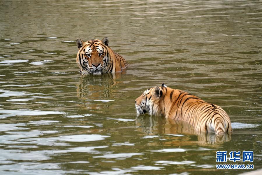 7月28日,在横道河子东北虎林园,东北虎在水中纳凉。时值盛夏,位于黑龙江省海林市的横道河子东北虎林园的东北虎活动量减少,以不同方式消夏纳凉。新华社记者王建威摄
