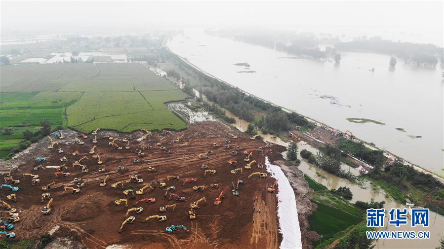 7月28日,在姜唐湖蓄洪区戴家湖一处涵闸险情处置现场,人们操作机械设备在抢筑临时圩堤(无人机照片)。新华社记者黄博涵摄