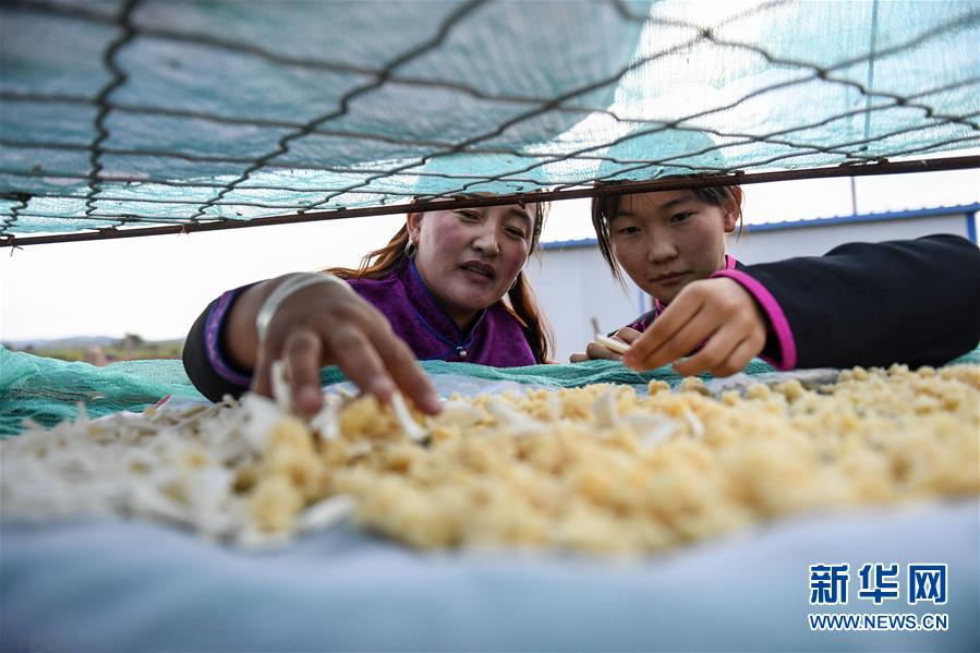 呼格吉勒的妻子萨如拉(左)和女儿苏日娜在院落里晾晒奶食品(7月23日摄)。新华社记者刘磊摄
