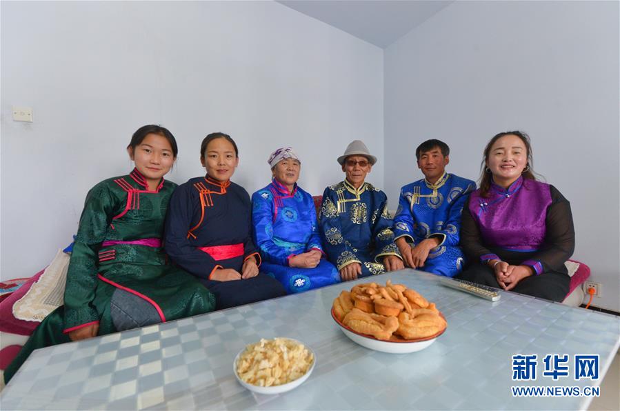 呼格吉勒一家在新房内合影,从左至右分别为:女儿苏日娜、妹妹阿荣高娃、母亲乌云格日勒、父亲孟克敖其尔、呼格吉勒、妻子萨如拉(7月26日摄)。新华社记者徐钦摄