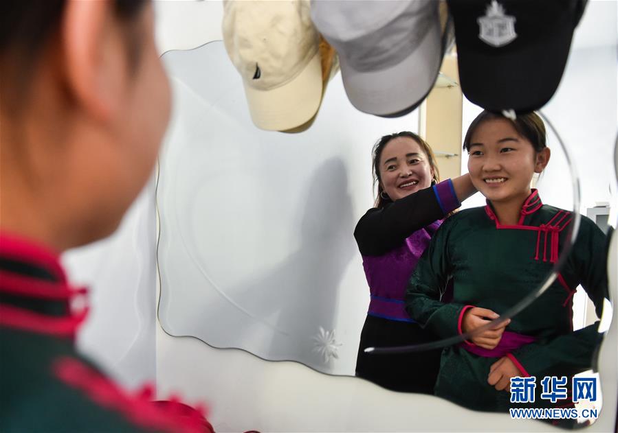 呼格吉勒的妻子萨如拉在新房里为女儿苏日娜整理头发(7月26日摄)。新华社记者徐钦摄