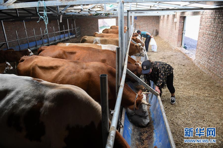 呼格吉勒(后)和妻子萨如拉在自家牛舍给母牛喂饲料(7月23日摄)。新华社记者刘磊摄
