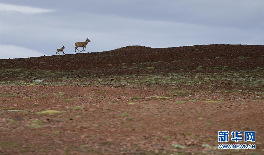 这是7月7日在可可西里卓乃湖区域拍摄的两只藏羚羊。新华社记者张龙摄