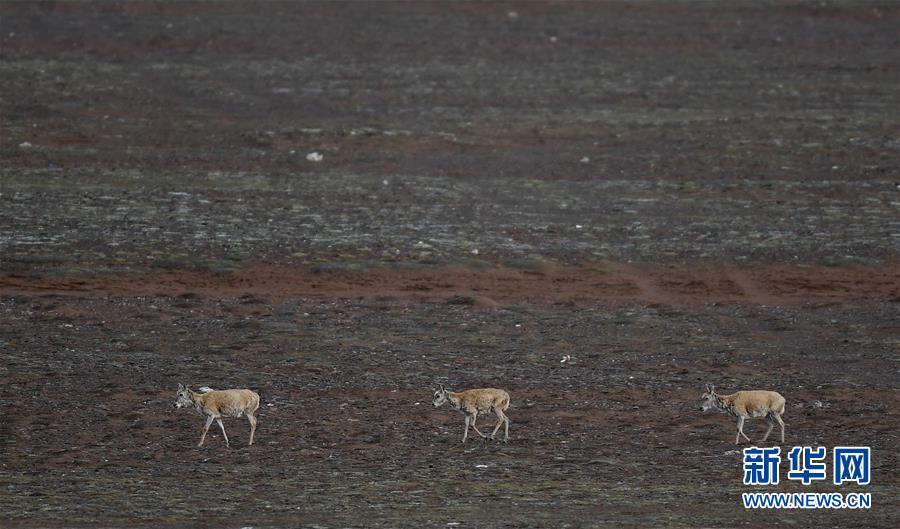 这是7月7日在可可西里卓乃湖区域拍摄的三只藏羚羊。新华社记者张龙摄