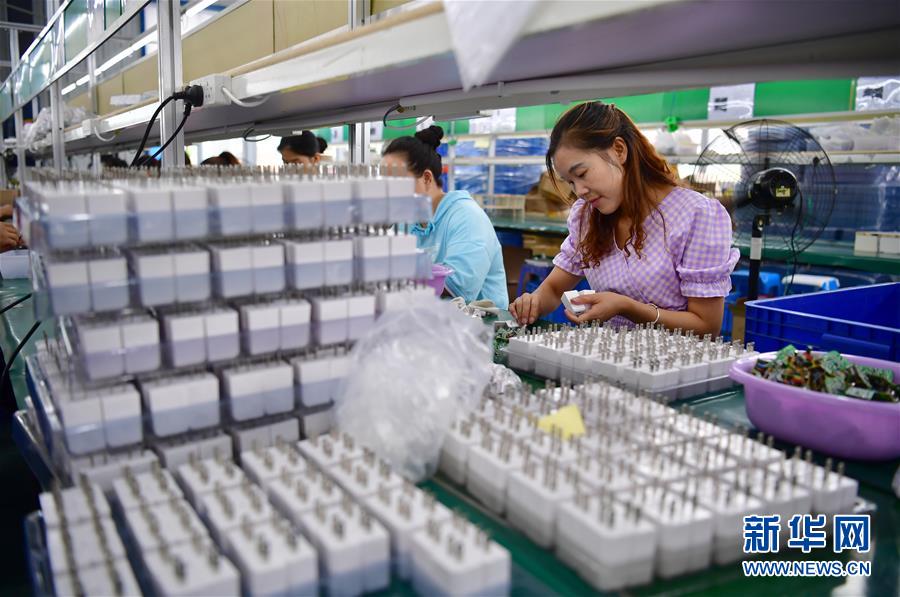 7月25日,在陕西汉阴县涧池镇紫云南郡易地扶贫搬迁安置社区的社区工厂内,社区居民在加工插头。陕南地区地处秦巴山区,是陕西脱贫攻坚的主战场。近年来,陕南各县区因地制宜、精准施策,通过发展社区工厂、特色种植、旅游扶贫、技能培训、电商带货等措施,促进多种产业发展,助力农民增收。新华社记者邵瑞摄