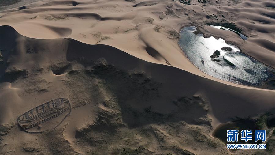 这是青海湖沙岛风光(7月28日摄,无人机照片)。盛夏傍晚,位于青海湖东北部的沙岛,岛内湖泊星罗棋布,沙丘连绵起伏,风景别致。金沙与湖水掩映,在阳光的勾勒下形成一幅美丽的画卷。新华社记者张宏祥摄