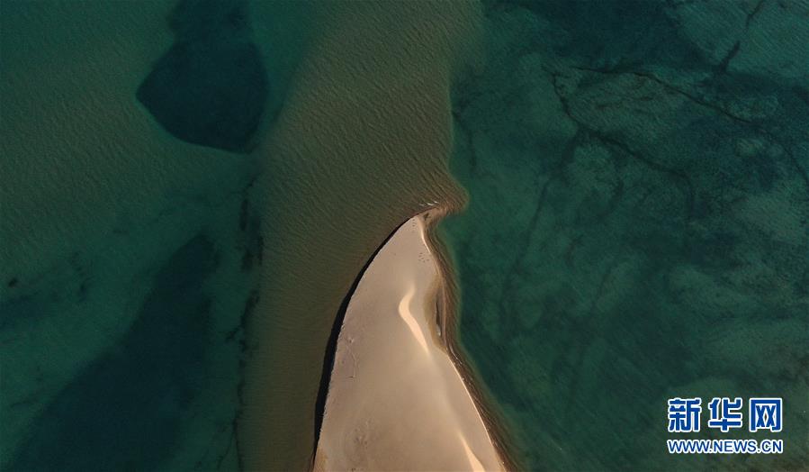这是青海湖沙岛一角(7月28日摄,无人机照片)。盛夏傍晚,位于青海湖东北部的沙岛,岛内湖泊星罗棋布,沙丘连绵起伏,风景别致。金沙与湖水掩映,在阳光的勾勒下形成一幅美丽的画卷。新华社记者张宏祥摄