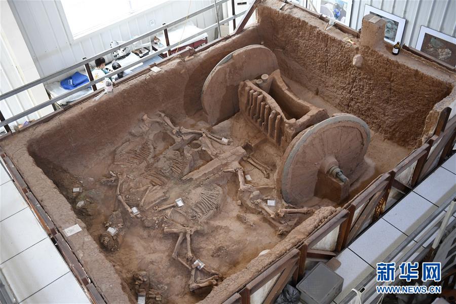 这是7月30日在陕西省考古研究院泾渭基地拍摄的西周晚期青铜轮牙马车。经过文物保护人员3年多连续不断的保护修复,一套总长超过3米的西周晚期青铜轮牙马车已保护和复原完毕。这套青铜轮牙马车2014年出土于陕西省宝鸡市岐山县周原遗址,马车长3.13米、宽2.7米、高1.5米,车头部位有4匹马的遗骸。马车车厢装饰华丽繁复,有大量镶嵌绿松石的青铜构件、薄壁青铜兽面装饰以及玉器和彩绘构件,车轮外沿全部由青铜铸造而成,这也是目前唯一一套部件完整的青铜轮牙马车。根据实验室提取的遗物和精确数据,考古工作者按照原来的工艺、结构对这辆青铜轮牙马车进行了同比例复原。这套青铜轮牙马车的保护和复原,对研究西周晚期的礼仪及车舆制度有重要价值。新华社记者李一博摄