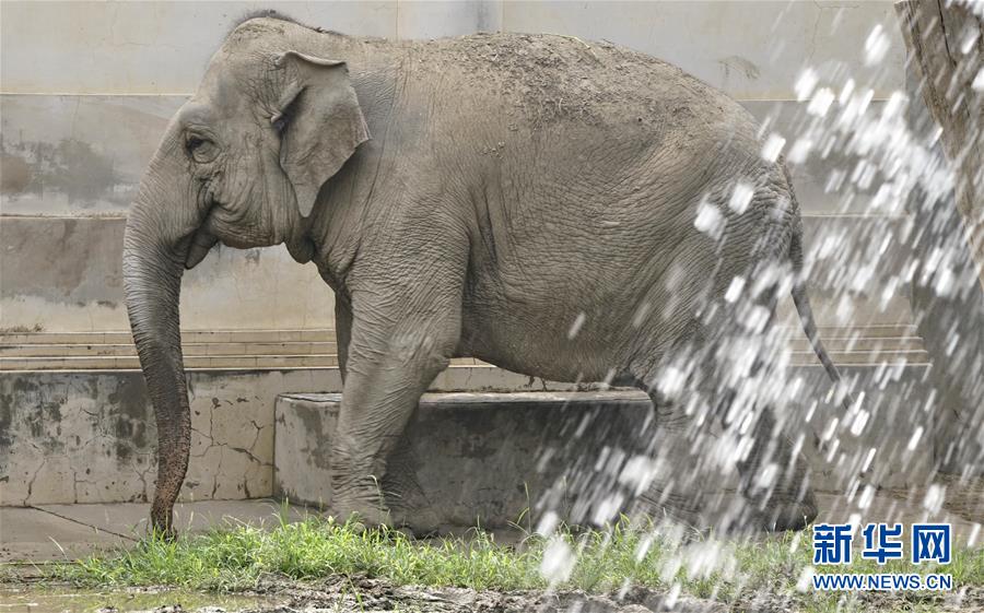 北京动物园的大象在降温喷淋设施旁(7月30日摄)。炎炎夏日,北京动物园根据动物生活习性,为动物配备了自动喷淋喷雾、空调笼舍、恒温水池、遮阳棚等各类避暑设施,同时还准备了西瓜等降温食品,保障动物平安舒适地度过伏天。新华社记者李欣摄