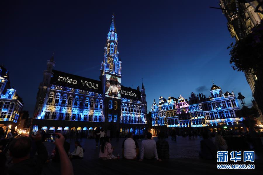 7月29日,人们在比利时布鲁塞尔大广场欣赏声光秀,市政厅外墙上投射出“想念你,音乐”的字样。7月29日,比利时布鲁塞尔大广场举行大型声光秀。艺术家在市政厅等历史建筑上投影文字和图案,纪念这个夏天受新冠疫情影响而不能如期举办的文化活动。新华社记者郑焕松摄
