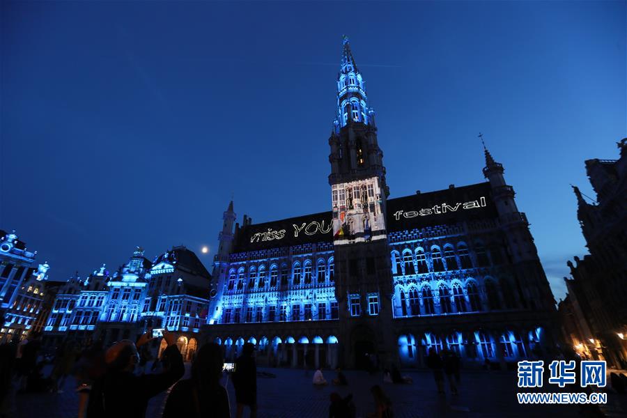 7月29日,比利时布鲁塞尔大广场的市政厅外墙上投射出“想念你,节日”的字样。7月29日,比利时布鲁塞尔大广场举行大型声光秀。艺术家在市政厅等历史建筑上投影文字和图案,纪念这个夏天受新冠疫情影响而不能如期举办的文化活动。新华社记者郑焕松摄
