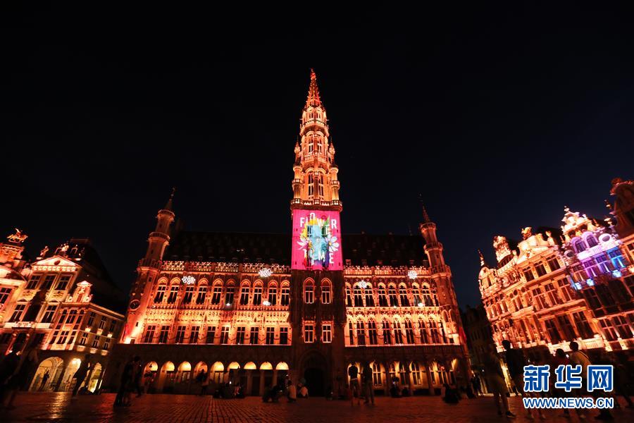 7月29日,人们在比利时布鲁塞尔大广场欣赏声光秀。7月29日,比利时布鲁塞尔大广场举行大型声光秀。艺术家在市政厅等历史建筑上投影文字和图案,纪念这个夏天受新冠疫情影响而不能如期举办的文化活动。新华社记者郑焕松摄