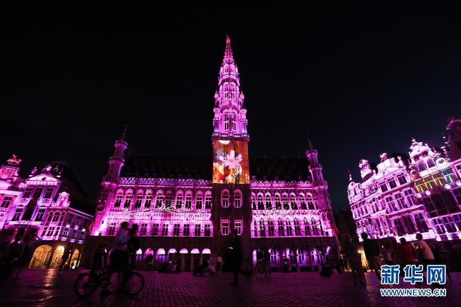 7月29日,人们在比利时布鲁塞尔大广场欣赏声光秀,市政厅外墙上投射出鲜花地毯主题的图案。7月29日,比利时布鲁塞尔大广场举行大型声光秀。艺术家在市政厅等历史建筑上投影文字和图案,纪念这个夏天受新冠疫情影响而不能如期举办的文化活动。新华社记者郑焕松摄