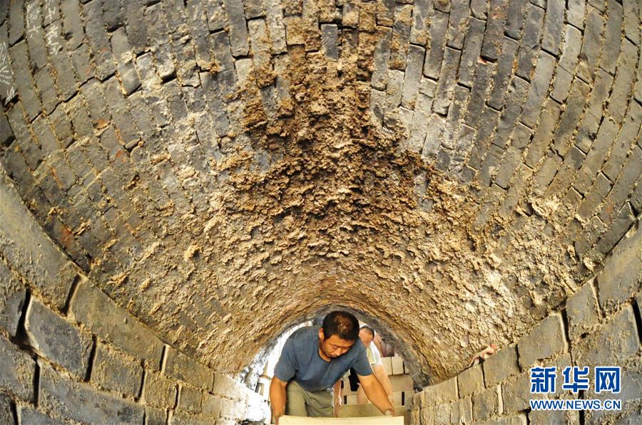 7月30日,河北省任丘市出岸镇古建砖厂工人将砖坯装窑以备烧制。新华社记者牟宇摄