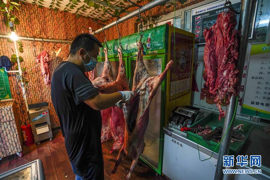 7月30日,在乌鲁木齐经济技术开发区(头屯河区)天鹅湖社区牛羊肉直销点,商贩在分割新鲜羊肉。新华社记者赵戈摄