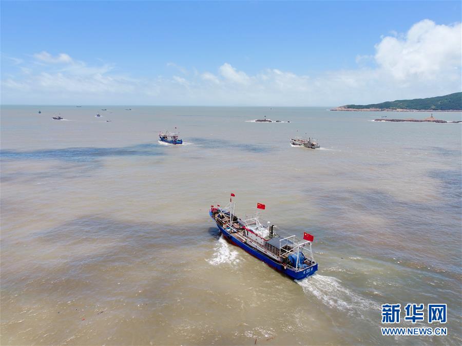 8月1日,在福建省霞浦县三沙镇海域,渔船开渔出海(无人机照片)。当日,福建省海域的灯光围(敷)网、张网、刺网、桁杆虾拖和笼壶作业渔船结束为期3个月的休渔期,开渔出海。在福建省霞浦县三沙镇,近两百艘渔船起航驶离码头,开始海上捕鱼作业。新华社记者姜克红摄