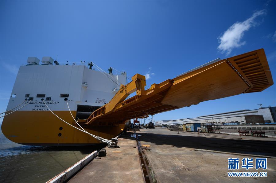 8月1日在位于蚂蚁岛的扬帆集团东海岸造船厂拍摄的一艘在建的汽车滚装船,月底即将交付给意大利客户。新华社记者黄宗治摄