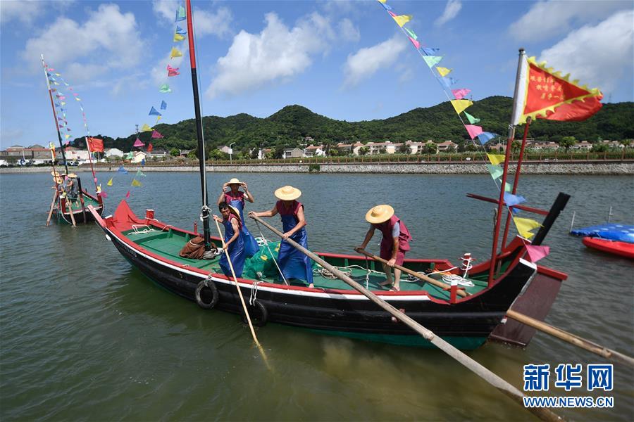 8月1日,蚂蚁岛居民在避风塘渔民劳作现场体验区为游客表演木帆船捕鱼。新华社记者黄宗治摄