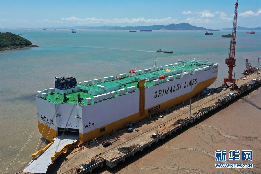 8月1日在位于蚂蚁岛的扬帆集团东海岸造船厂拍摄的一艘在建的汽车滚装船,月底即将交付给意大利客户(无人机照片)。新华社记者黄宗治摄