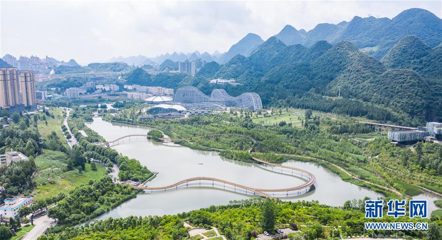 六盘水明湖国家湿地公园风景(无人机照片,6月17日摄)。新华社记者陶亮摄