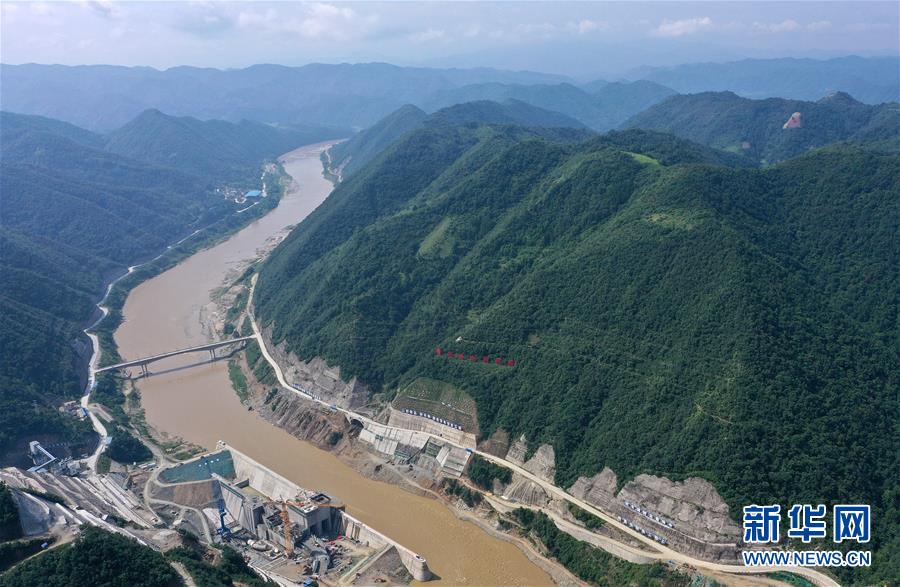 8月3日拍摄的黄金峡水利枢纽坝址全貌(无人机照片)。盛夏时节,在秦岭深处的黄金峡水利枢纽工地上,施工人员冒着酷暑加班加点奋战,以确保今年11月进行右岸二期截流。黄金峡水利枢纽坝址位于汉江干流上游峡谷段,是引汉济渭工程的重要组成部分。新华社记者陶明摄