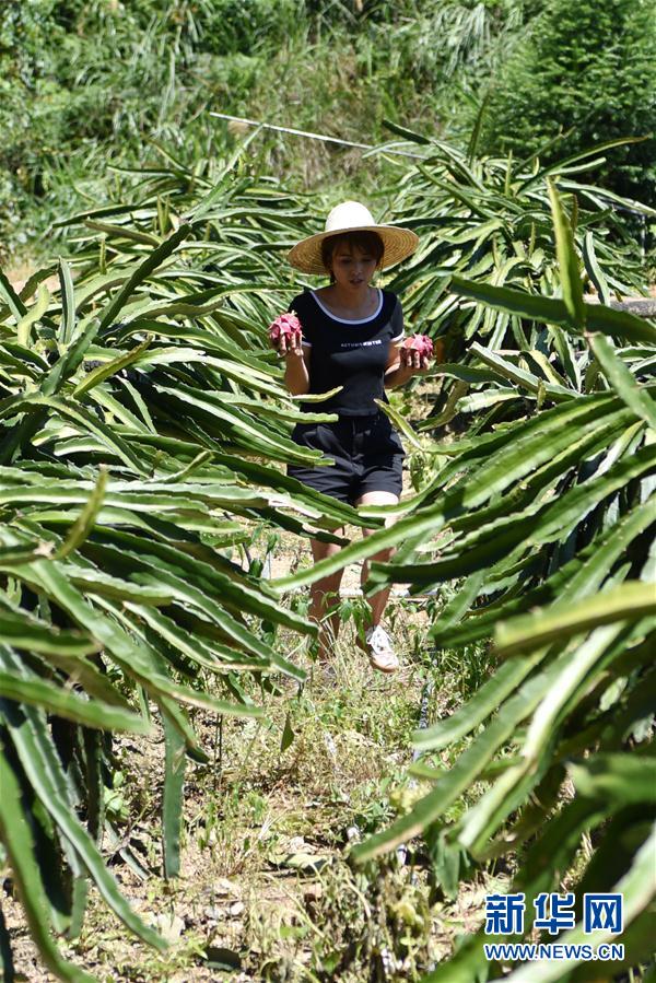 8月3日,在碗米坡镇首八峒村,种植基地负责人易润菊采摘成熟的火龙果。