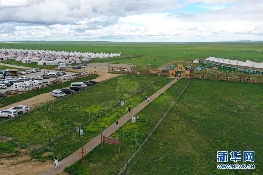 8月4日,游客在呼伦贝尔新巴尔虎左旗的民俗旅游度假景区游玩(无人机照片)。今年暑期,内蒙古呼伦贝尔通过暂行周末2.5天弹性休假工作制度,发放旅游、餐饮消费券,景区推出优惠促销活动等措施,提振当地旅游市场。新华社记者徐钦摄