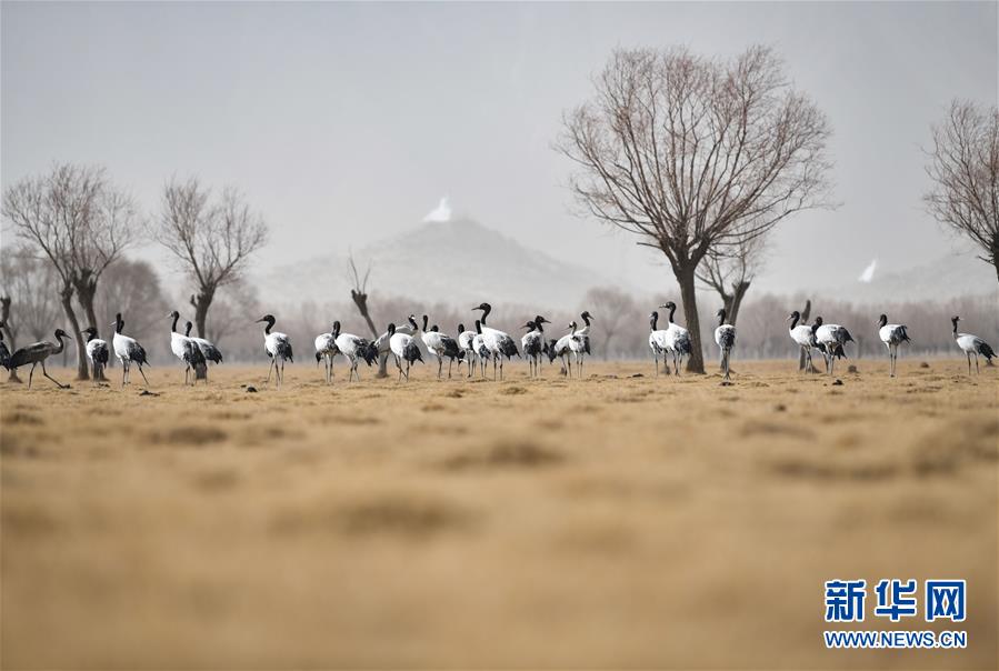 西藏山南市境内雅鲁藏布江北岸的黑颈鹤(3月11日摄)。新华社记者晋美多吉摄