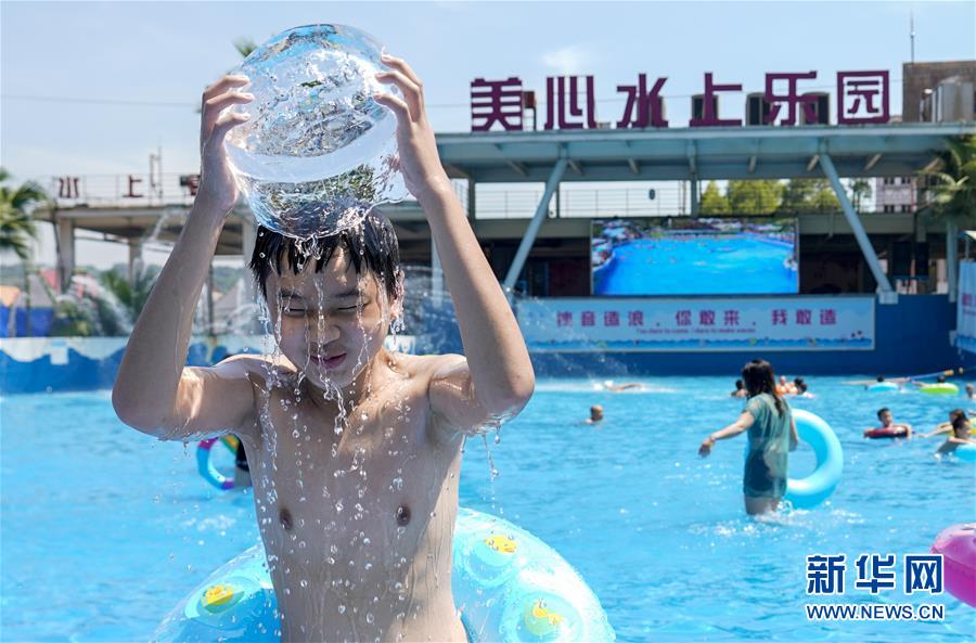 8月5日,重庆涪陵红酒小镇水上乐园内,市民在水中嬉戏。当日,重庆市气象台再次发布“高温橙色预警信号”,重庆大部分海拔400米以下地区日最高气温将升至37℃以上,局地可达40℃以上。许多重庆市民涌进当地的水上乐园和泳池,在水中享受夏季的清凉。新华社记者刘潺摄