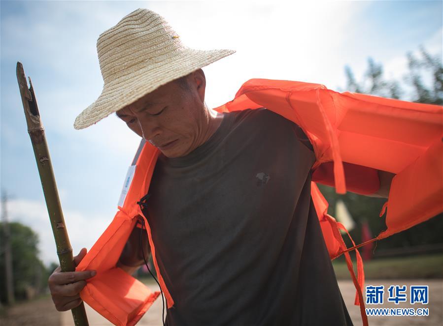 8月5日,夏德勤穿上救生衣准备去堤坝的迎水面巡查。新华社记者肖艺九摄
