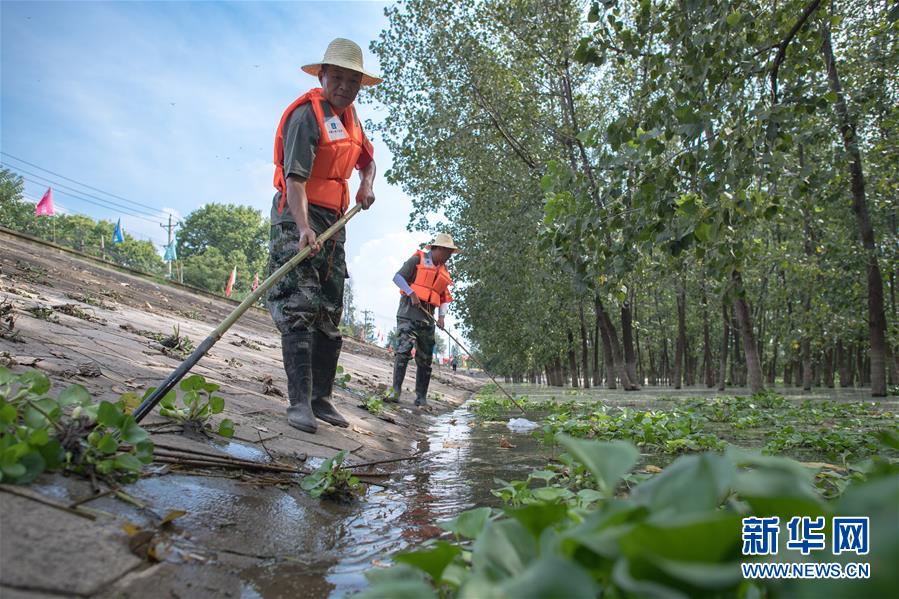 8月5日,夏德勤(左)与同事在长江武金堤上巡查。新华社记者肖艺九摄