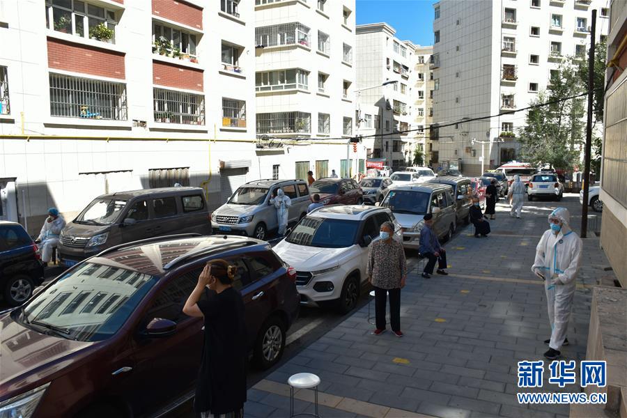 8月5日,居民在乌鲁木齐市天山区山西巷社区排队等待核酸检测。新华社记者高晗摄