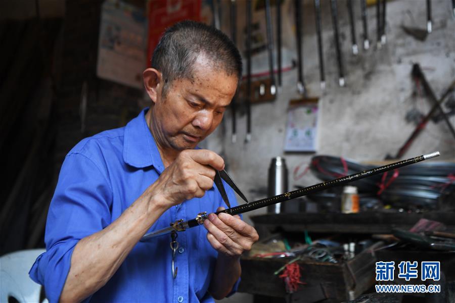 8月5日,丰盛古镇经营秤杆店的居民王泽喜在制作秤杆。近年来,重庆市巴南区引入社会资本,按照“修旧如旧、适度开发”的原则对丰盛古镇进行保护性修缮和景区化打造,让古镇在保留原有历史人文风貌的同时,焕发新活力。新华社记者王全超摄