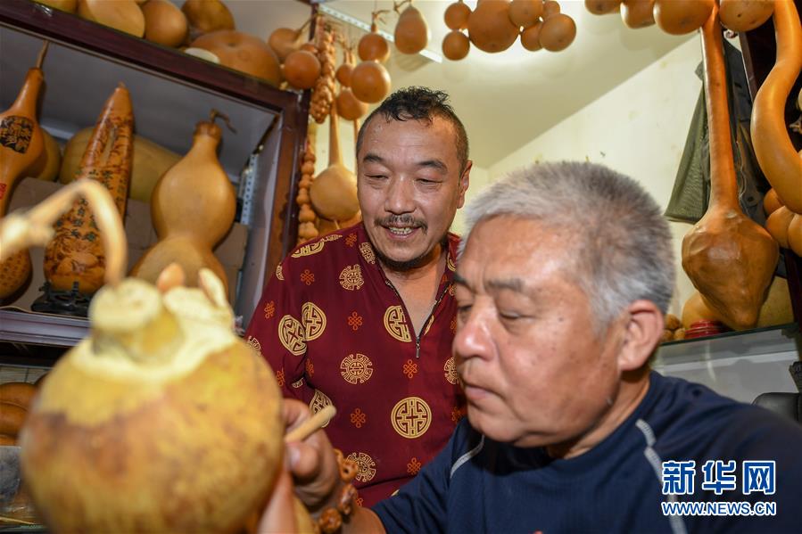 8月5日,侯景伟(左)向徒弟金志勇传授技艺。今年55岁的吉林四平人侯景伟自幼与家人学习雕刻、烙画艺术。经过多年潜心研究,他将浮雕和烙画工艺相结合,通过抛光、起稿、雕刻、烙烫、套色等十余道工艺,制作展现传统文化、民俗故事的葫芦工艺品。2020年,侯景伟被评为四平市非物质文化遗产项目侯氏葫芦雕刻烙画代表性传承人。他说:“希望有更多人加入到非遗传承队伍中,让小葫芦‘讲’出更多民俗故事。”新华社记者张楠摄
