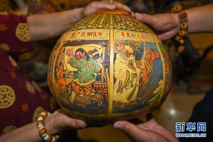 这是侯景伟创作的民俗主题葫芦工艺品(8月5日摄)。今年55岁的吉林四平人侯景伟自幼与家人学习雕刻、烙画艺术。经过多年潜心研究,他将浮雕和烙画工艺相结合,通过抛光、起稿、雕刻、烙烫、套色等十余道工艺,制作展现传统文化、民俗故事的葫芦工艺品。2020年,侯景伟被评为四平市非物质文化遗产项目侯氏葫芦雕刻烙画代表性传承人。他说:“希望有更多人加入到非遗传承队伍中,让小葫芦‘讲’出更多民俗故事。”新华社记者张楠摄