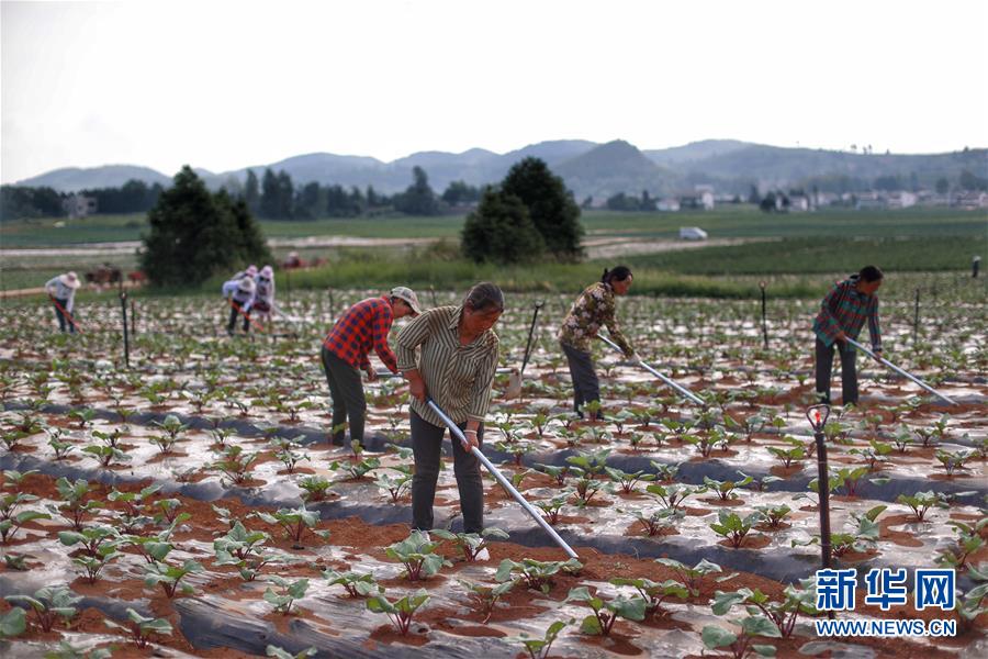 8月6日,村民在威宁县草海镇中海社区蔬菜基地种植红菜苔。新华社记者刘续摄