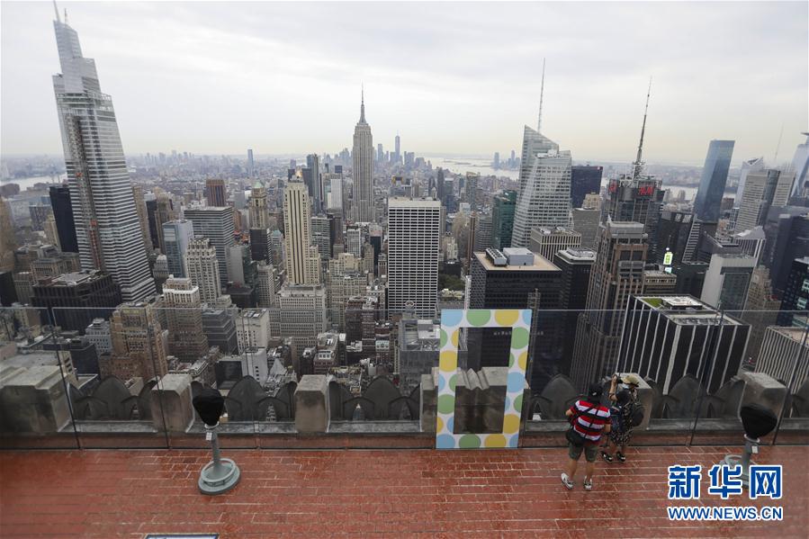 8月6日,在美国纽约,人们在洛克菲勒中心观景台上观看城市景观。当日,3月份暂时关闭的洛克菲勒中心观景台恢复对公众开放。每天13时至21时,人们可戴口罩前往参观。新华社记者王迎摄