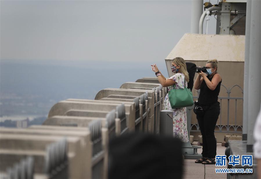 8月6日,在美国纽约,人们在洛克菲勒中心观景台上拍摄城市景观。当日,3月份暂时关闭的洛克菲勒中心观景台恢复对公众开放。每天13时至21时,人们可戴口罩前往参观。新华社记者王迎摄
