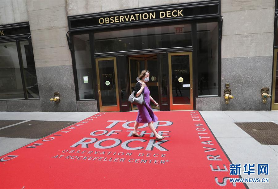 8月6日,在美国纽约,一名女子从洛克菲勒中心观景台的入口走过。当日,3月份暂时关闭的洛克菲勒中心观景台恢复对公众开放。每天13时至21时,人们可戴口罩前往参观。新华社记者王迎摄