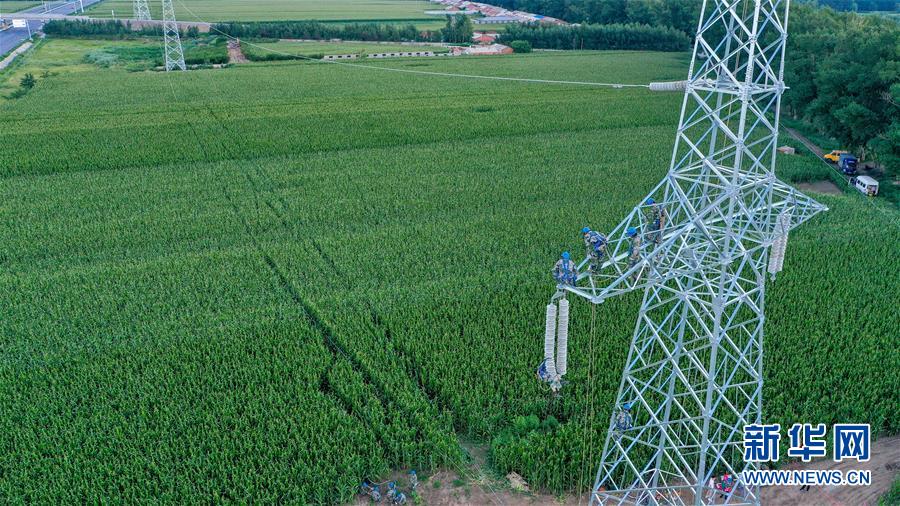 8月6日,几名送电工在吉林省长春市城郊的一处输电铁塔上施工作业(无人机照片)。吉林省长春市连续多日出现高温天气,国网长春供电公司输电运检中心的送电工们每天清晨开始作业,不畏烈日“烤”验,坚守工作岗位,确保工程按计划完成。新华社记者张楠摄