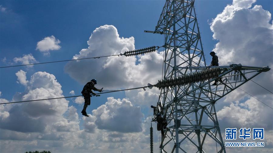 8月6日,几名送电工在吉林省长春市城郊的一处输电铁塔上施工作业(无人机照片)。吉林省长春市连续多日出现高温天气,国网长春供电公司输电运检中心的送电工们每天清晨开始作业,不畏烈日“烤”验,坚守工作岗位,确保工程按计划完成。新华社记者张楠摄