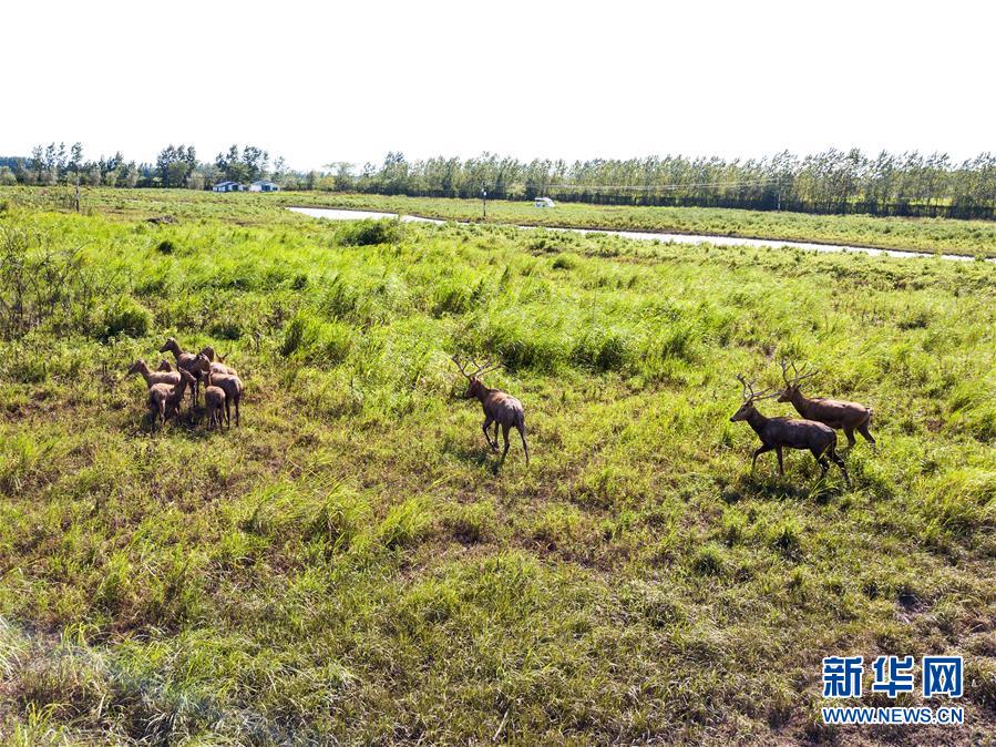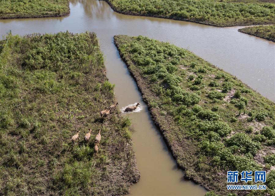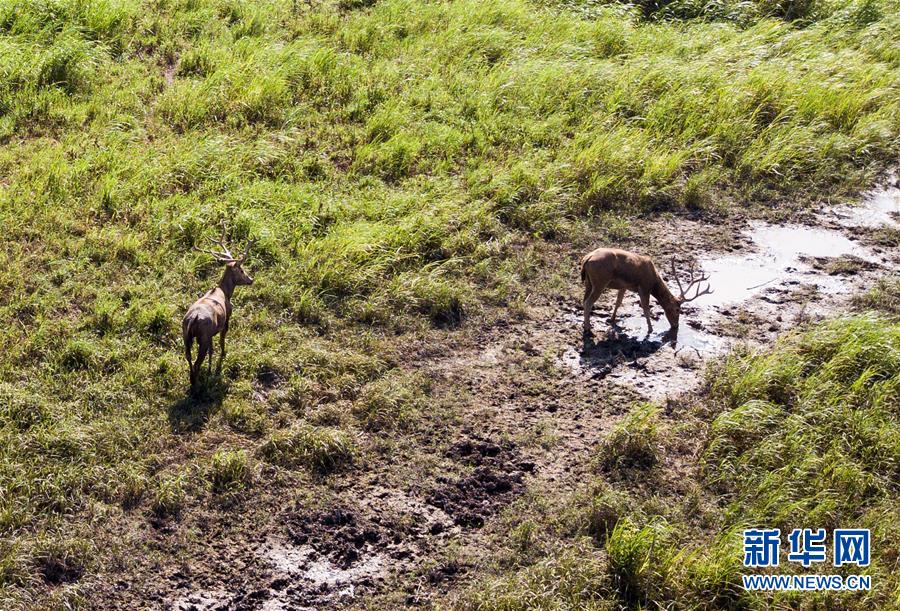 这是8月7日在东洞庭湖麋鹿和鸟类救治避难中心拍摄的麋鹿(无人机照片)。位于湖南省岳阳市的东洞庭湖麋鹿和鸟类救治避难中心成立于2016年9月,占地400余亩,中心自建成后就承担起东洞庭湖区域全部麋鹿的救援、医治、康复和喂养任务。目前该中心共有14只麋鹿正在接受救助。新华社记者李鑫摄